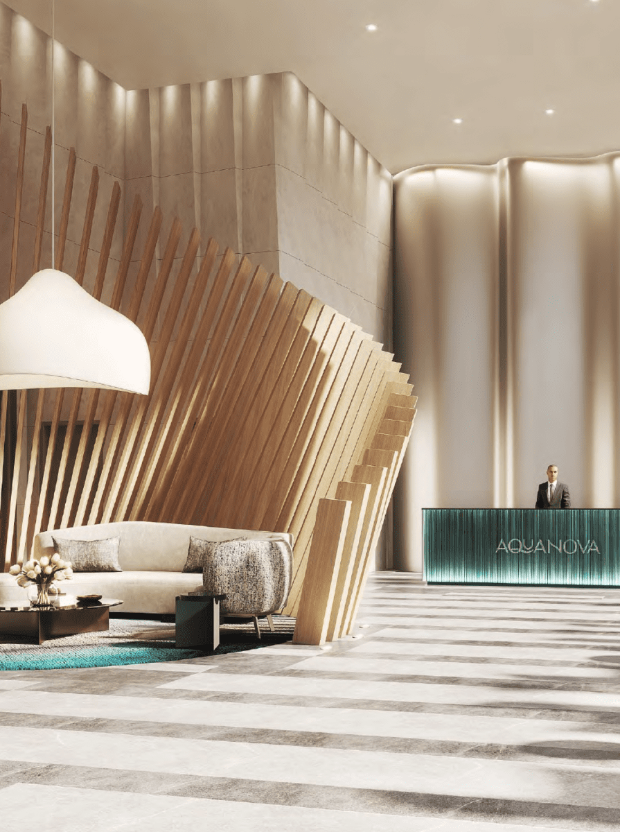 Inspired by the rhythmic flow of water, the lobby’s design captures the essence of lakeside living with sleek finishes, dynamic lighting, and thoughtfully curated art installations. The concierge stands ready to assist with your every need, while comfortable lounge areas provide a perfect space to relax and greet your guests.