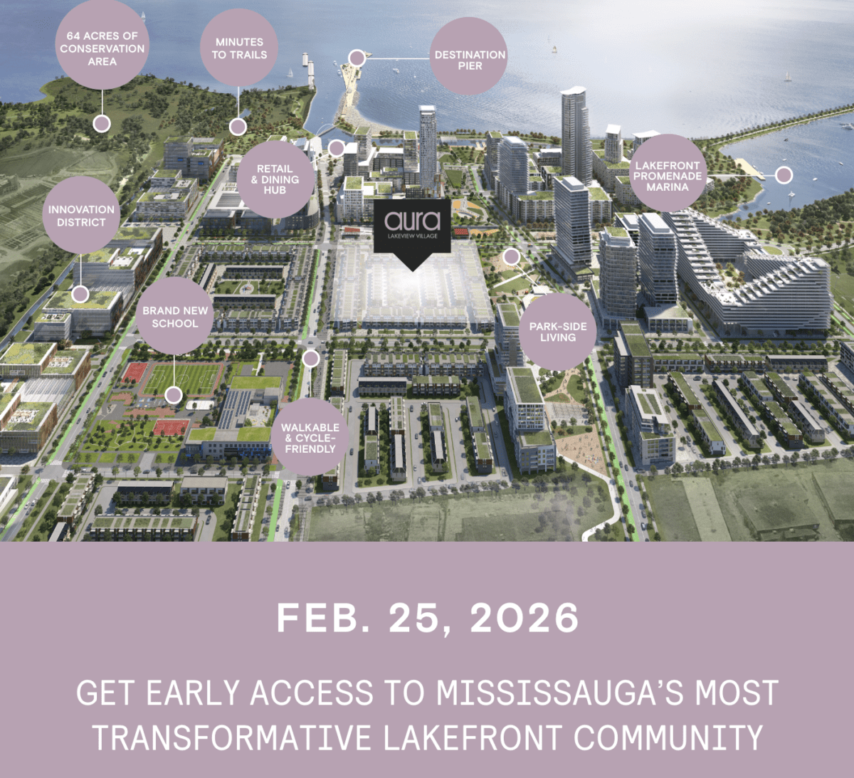 At Aura, you’re part of Canada’s most transformative waterfront community. Lakeview Village brings together parks, trails, dining culture and year-round programming to create a complete lifestyle experience. From waterfront recreation to vibrant community gatherings, every day offers something new to discover.