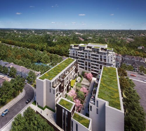 The community is made up of two elements: an eight-storey mid-rise building fronting McCowan Rd with 69 suites, indoor amenities and retail at grade. In the rear, an immaculate courtyard, surrounded by three five-storey low-rise buildings offering 61 suites with double wide single-level suites, and spacious two- and three-level suites with full-width private garden patios and stunning oversized rooftop terraces – perfect for entertaining, relaxing, and enjoying the outdoors.