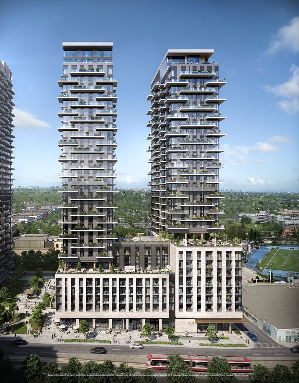 The largest master-planned community in Forest Hill, Forêt features three towers with over 1,000 luxury residences and a boutique residence offering exclusive amenities, elevators, and a finished package designed exclusively for high society. The development will include a daycare facility with an outdoor play area, as well as retail along the widened public boulevards.