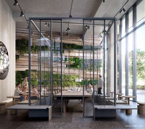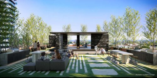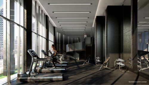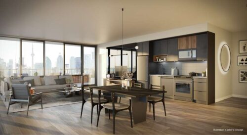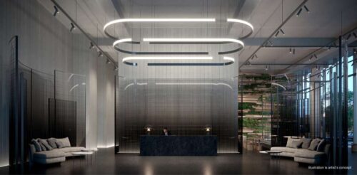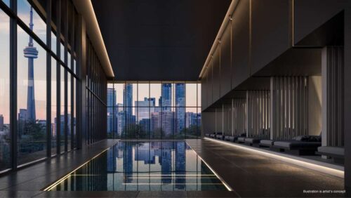 The amenities offer a soaring double-height and 50-foot long pool/ lounge with a feature view of the CN Tower. The suite interiors merge contemporary and modern touches through clean lines and the integration of black stainless steel appliances.